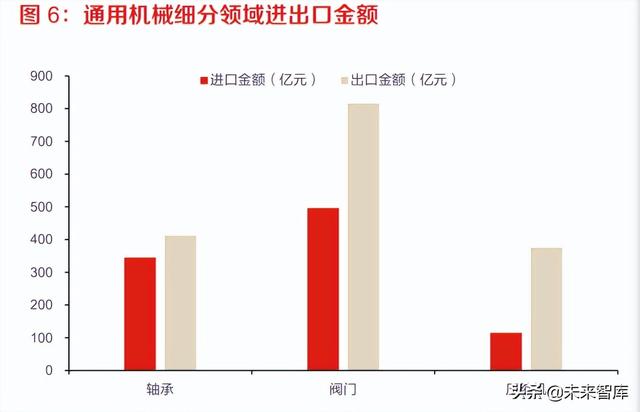 通用 机械进口金额低于出口金额,出口增长迅速,近两年出口金额达到进口金额 2 倍以上。通用机械 中,压缩机 2020 年进口额 115.37 亿元,出口额 375.69 亿元,压缩机进口单价接近出口单价 5 倍;阀门及类似装置 2020 年进口额 327.29 亿元,出口额 815.85 亿元,进口单价约接近出口单价 3 倍;轴承 2020 年进口额 345.14 亿元,出口额 411.88 亿元,进口金额 / 出口金额值相对较高。