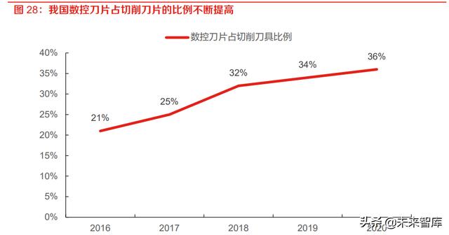 国产刀具向高端市场延伸,进口替代速度加快。近年来,国内刀具企业在不断引进消化吸收国外 先进技术的基础上,研究成果和开发生产能力得到了大幅提升,把控刀具性能的能力不断增强, 国产刀具向高端市场延伸,凭借产品性价比优势,已逐步实现对高端进口刀具产品的进口替代, 加速了数控刀具的国产化。根据中国机床工具工业协会数据,2019 年我国刀具市场总消费规模约为 393 亿元,进口刀具规模为 136 亿元,其中绝大部分是现代制造业所需的高端刀具。2016- 2020 年进口刀具占总消费的比重从 37.17%下降至 31.12%,反映我国数控刀具的自给能力在逐步 增强,进口替代速度加快。