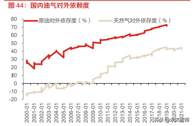 油气储采比年限较低:近年来我国原油产量保持稳定、天然气产量上升,但从储量的角度看,我 国油气储量依然处于较低水平。2020 年我国原油储采比在 5 年左右,天然气储采比在 7-18 年, 处于全球较为低的水平。我们认为我国油气进口依赖度高的深层次原因在于地质储量较低、或勘 探开发程度仍然较低。