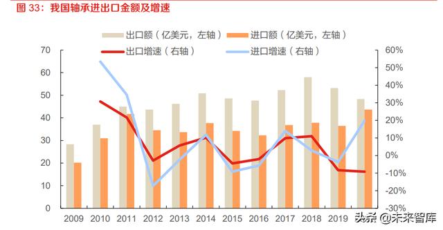 我国轴承出口额波动上升,贸易顺差不断提升。2009 年以前,我国轴承进口金额和出口金额基本 持平。2009 年,我国轴承出口金额 28.3 亿美元,首次超过进口金额;2012-2018 年,我国轴承 贸易顺差持续扩大,2018 年轴承贸易顺差较 2012 年增长了 119.57%。2020 年,我国轴承进出 口总额为 92 亿美元,其中,出口总额 48.34 亿美元,同比下降 9.14%;进口总额 43.66 亿美元, 同比增长 19.78%。