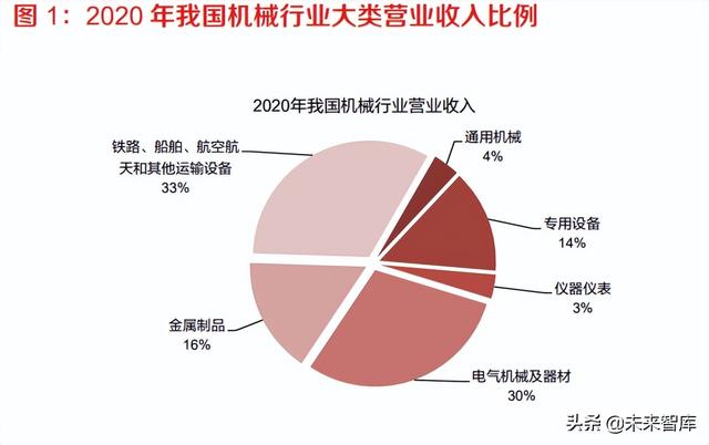 机械制造是经济发展的支柱:各个行业的发展须以机械制造业的支持及其提供的装备为基础,在 我国社会经济的发展过程中,机械制造发挥了基础支撑的作用,后续在进一步促进经济发展中仍 然具有重要作用。在国民经济生产力构成中,制造技术的作用超过 60%。《中国制造 2025》的 提出,标志着振兴机械工业成为我国经济增长方式转型的关键。2020 年,全国机械工业实现营业 收入 22.85 万亿元,机械工业主要涉及的国民经济大类可分为金属制品;通用设备;专用设备; 铁路、船舶、航空航天和其他运输设备;电气机械及器材和仪器仪表制造业 6 类。