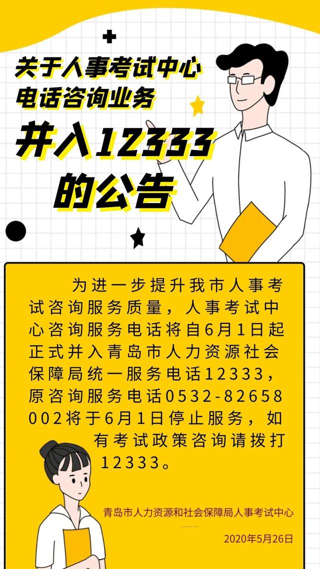 青岛人事考试网(青岛市人力资源考试网) 为进一步提升我市人事考试咨询服务质量,人事考试中心咨询服务电话将自6月1日起正式并入青岛市人力资源社会保障局统一服务电话12333,原咨询服务电话0532-82658002将于6月1日停止服务,如有考试政策咨询请拨拔打12333。 (来源:青岛市人力资源社会保障局公众号)