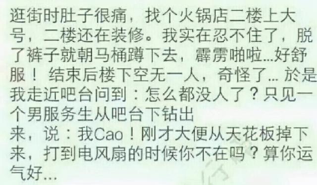 63. 一次去肯德基上厕所,便池是那种手压的,拉完以后正要去冲水,发现在那个阀上写着四个字:“小心轻压”,那个摁压阀的两边分别 贴着“别用 坏了”。我心想冲个水还能冲坏了?KFC你也太小气了吧。结果一摁……“噗—–”喷我一腿的屎!!!我这才发现,原来那四个字应该从靠我站的一边往另一边念。 有事去办公室找领导。正好碰到一大妈前来应聘。领导:你以前都干过什么活。大妈:俺刚从老家出来!今年头一回出来,没有什么工作经验。领导挠挠头:我们这只招熟练工呀!在老家养过猪吗??大妈:养过啊。领导:好!那明天你来上班吧!我一直很好奇大妈的职位。直到今早看到大妈在食堂里忙碌。。。