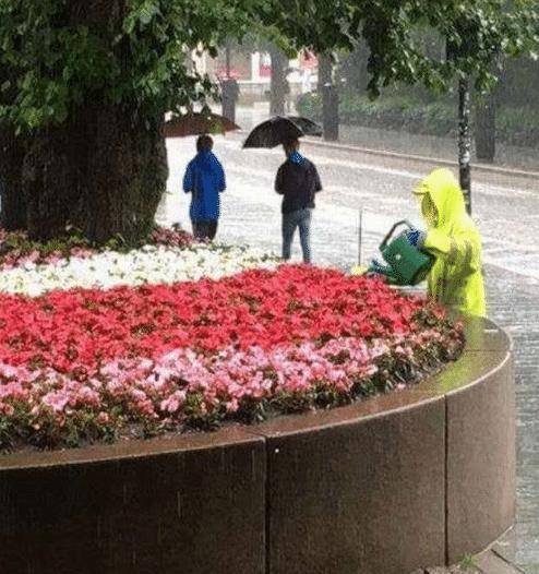 97. 真的很佩服有些人可以在某件事情上做到风雨无阻,比如这位正在浇花的工作人员,外面下着这么大的雨,他还是执意要自己提着水壶浇花。