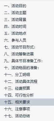 在大学过程中,活动策划书是很多同学的痛点之一,以下为大家总结一些活动策划的写作经验,希望能帮到你。在写活动策划时,首先应该明确策划的内容,主要是对什么进行策划。不能在连主题都不知道的情况下就乱写一通。每份活动策划书最基本的项目要有名称、时间、地点、意义、对象、具体流程、经费预算、落款和时间等;目录应该简洁明了,它是整个策划案的索引,应让阅读者一目了然。作为策划的重点部分,活动内容表现方式要简洁明了,使人容易理解,但表述方面要力求详尽,写出每一点能设想到的东西,没有遗漏。应按照时间的先后顺序排列,绘制实施时间表有助于方案核查。人员的组织配置、活动对象、相应权责及时间地点也应在这部分加以说明,执行的应变程序也应该在这部分加以考虑。