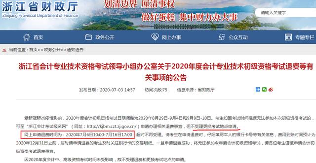 (二)会计初级资格退费申请时间为2020年7月15日至24日,逾期不予受理。考生一经提交2020年度初级资格考试退费申请后,将无法参加本年度会计初级资格考试,应慎重决定是否申请会计初级资格考试退费。
