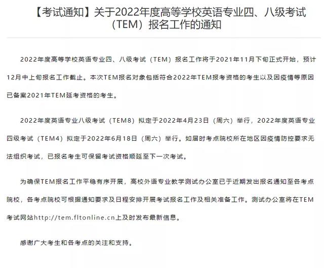 2022年度英语专业四级考试(TEM4)拟定于2022年6月18日(周六)开考。