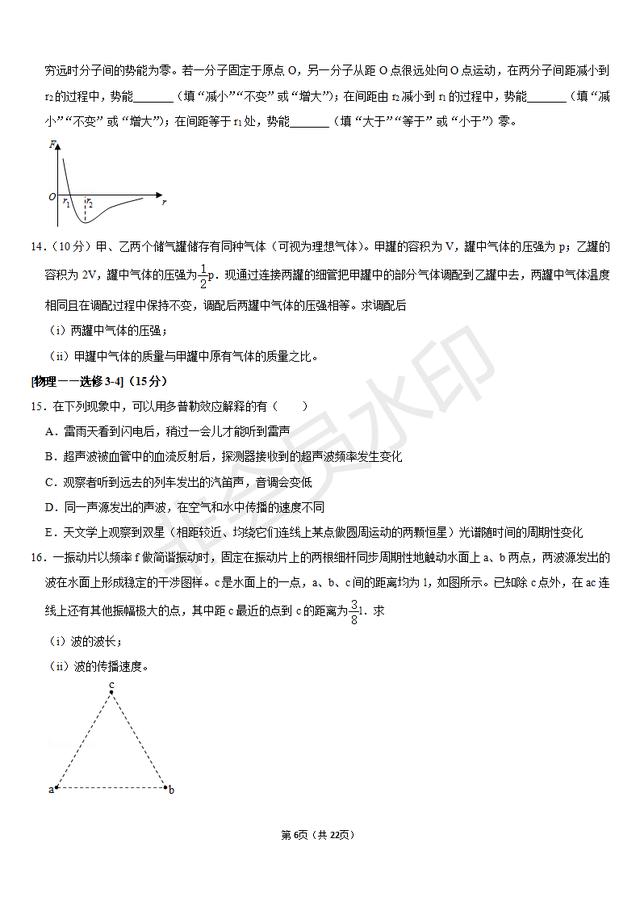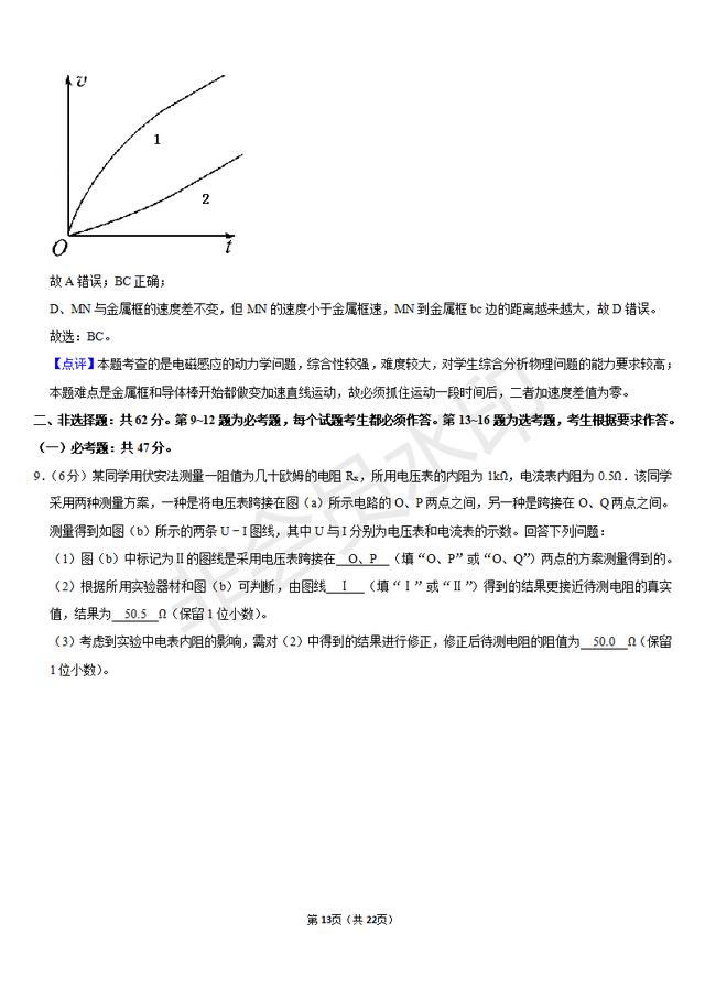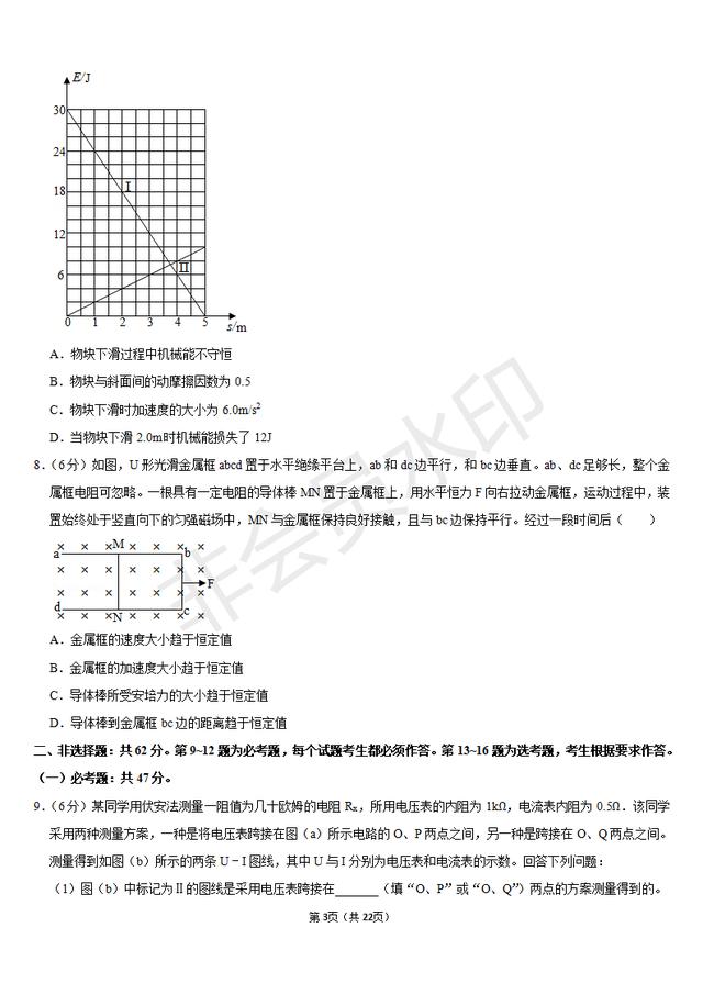 二、非选择题:共62分。第9~12题为必考题,每个试题考生都必须作答。第13~16题为选考题,考生根据要求作答。(一)必考题:共47分。(二)选考题:共15分。考生从2道物理题中任选一题作答。如果多做,则按所做的第一题计分。[物理–选修3-3](15分)