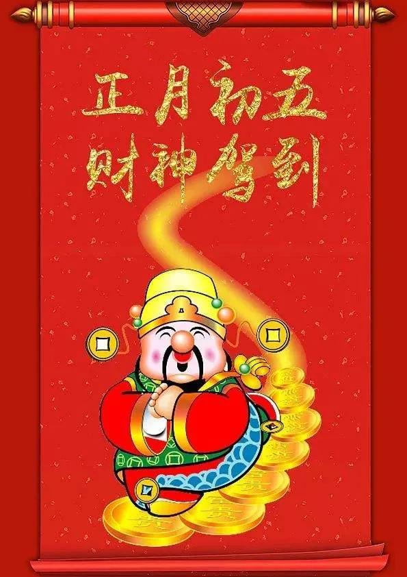 虎年正月初五财神日,文财神为你种下摇钱树,武财神为你养起金钱豹,情财神为你送来招财猫,福财神为你唤来美金蟾,富财神为你端来聚宝盆,齐心祝你新年发大财,大吉大利行大运!