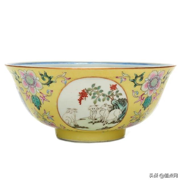 Lot 2870|清光绪 黄地轧道粉彩三羊开泰图膳碗