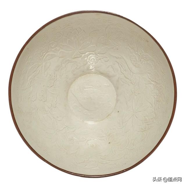 此碗断代宋代,碗内浮雕雕刻荷花荷叶等吉祥花卉纹饰,碗底刻双鱼纹,釉面轻薄见胎,体现定窑刻花工艺之精美。来源方面,此碗曾于1981年洛杉矶苏富比6月8日东方艺术专场拍卖会上拍。