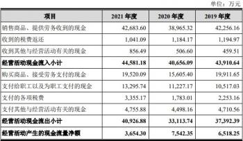 2019年至2021年,浩瀚深度销售商品、提供劳务收到的现金分别为4.23亿元、3.90亿元、4.27亿元;经营活动产生的现金流量净额分别为6518.25万元、7542.35万元、3654.30万元。