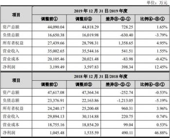 截至2019年末,浩瀚深度调整前的资产总额、负债总额、所有者权益分别为44,090.04万元、16,650.38万元、27,439.66万元,调整后分别为44,818.29万元、16,019.98万元、28,798.31万元,差异分别为728.25万元、-630.40万元、1,358.65万元。