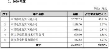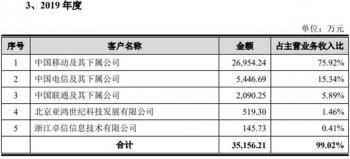 报告期内,中国移动为浩瀚深度第一大客户,公司每年对其的销售金额分别为2.70亿元、3.22亿元以及3.48亿元,占公司当期主营业务收入的比例分别为75.92%、87.91%以及85.05%,公司对中国移动存在依赖性。
