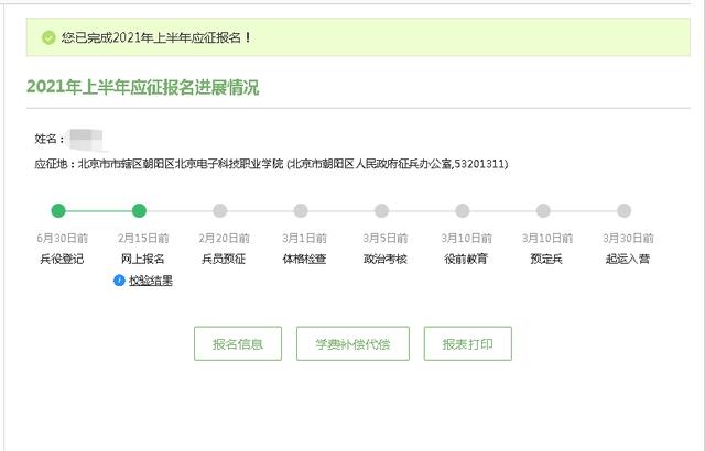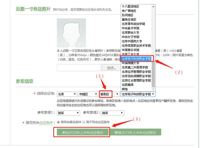 参军信息中“选择应征地”填写:北京-市辖区-朝阳区-北京电子科技职业学院。最后,点击“参加2021年上半年应征报名”。