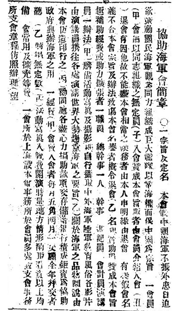 8月31日,“补助海军兴复社”经过扩充,更名为“协助海军会”,发布了《协助海军会章程》,在“办法”第一条即写明“购备活动写真及摄影机 自行摄取中外海军陆军教育风俗各影片 由演讲员携往各处演讲世界大势 趋重海军之要旨”。
