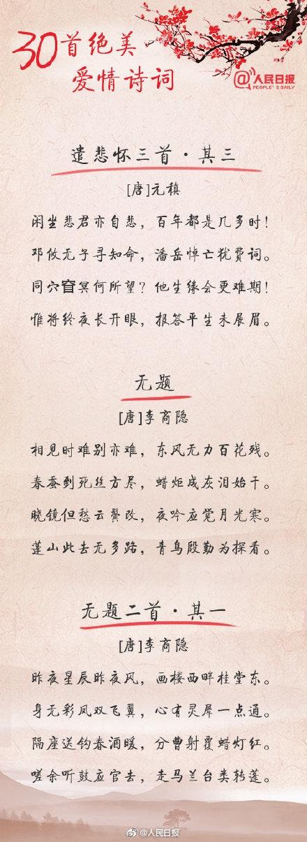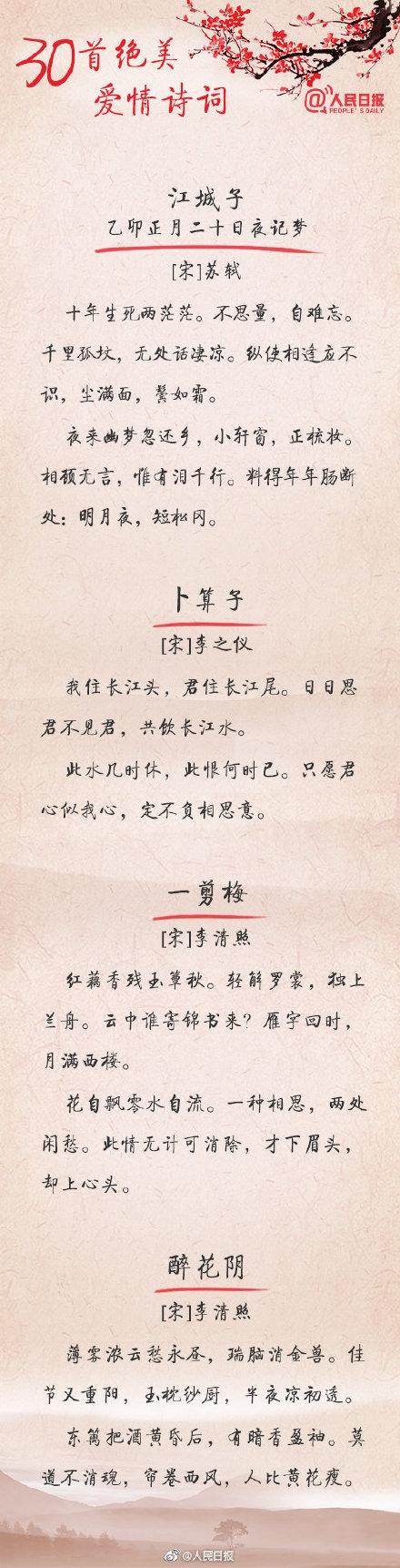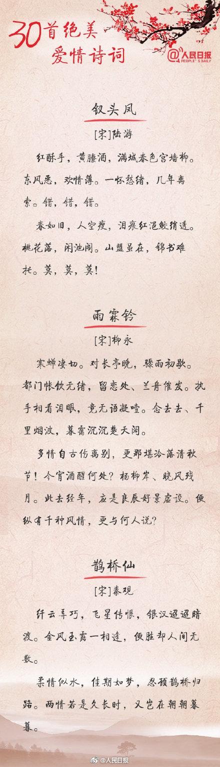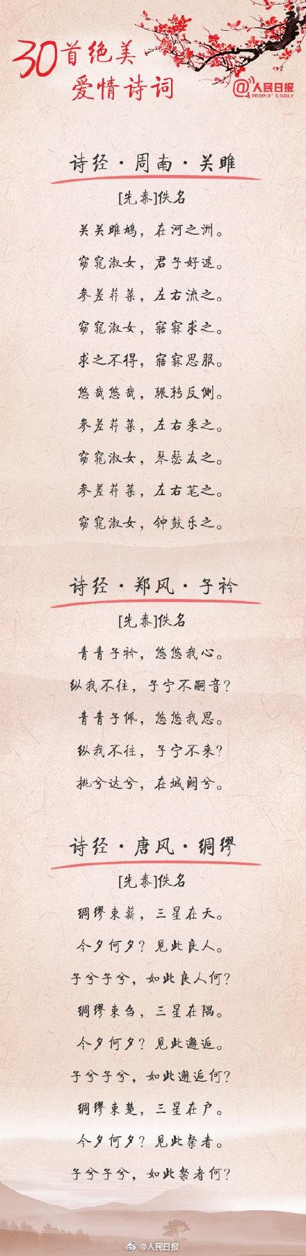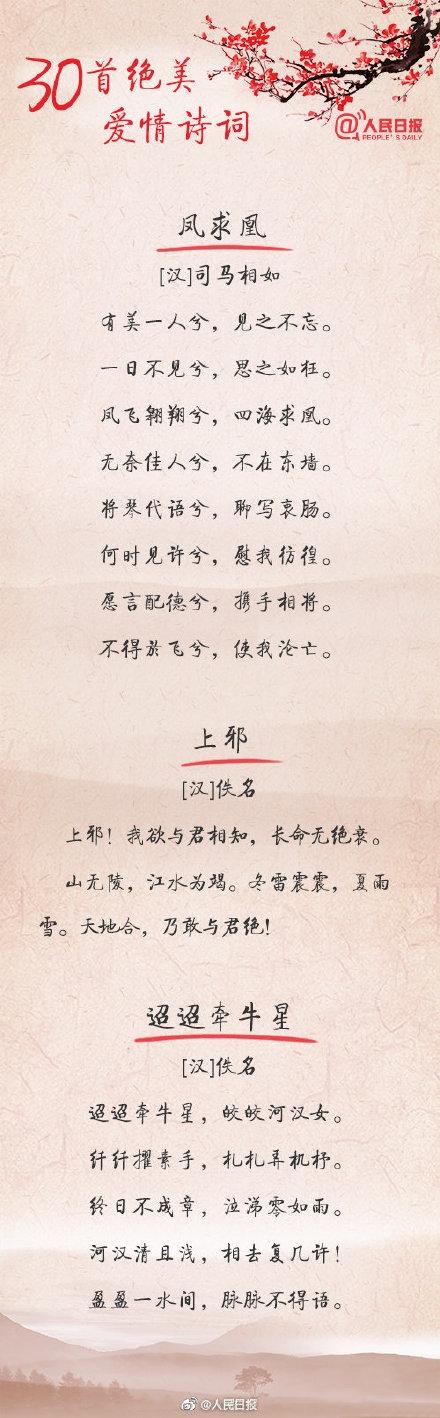 人民日报官微总结了30首爱情诗词,一起来看看古人们是如何表白的吧: