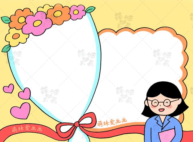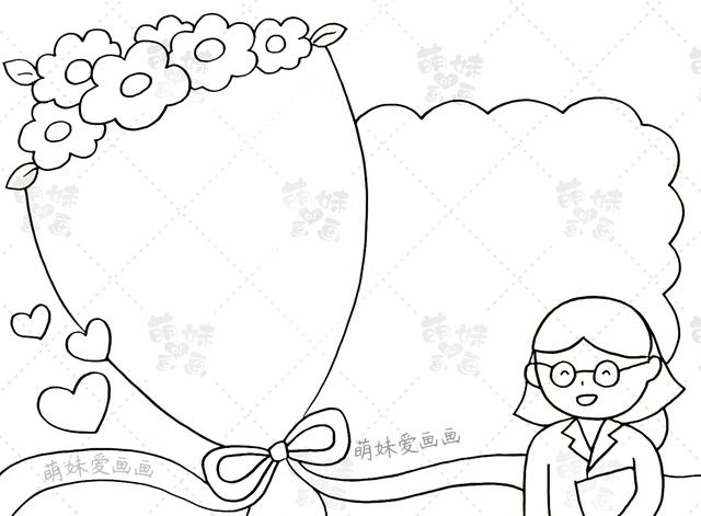 我们先在画面的右下角绘制出老师的形象,用花束、波浪线来作为手抄报的边框。