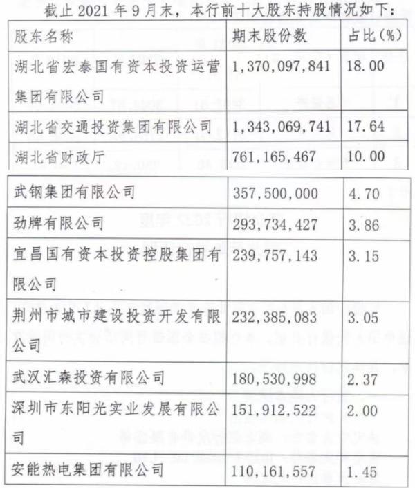 中国货币网披露的湖北银行2022年同业存单发行计划显示,截至2021年9月末,湖北省财政厅为湖北银行第三大股东,持有湖北银行7.61亿股,持股比例为10%;长江产业投资集团有限公司则不在湖北银行前十大股东之列。