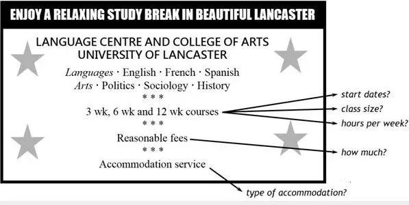 假定你是李华,计划暑假期间去英国学习英语,为期六周。下面的广告引起了你的注意,请给该校写封信,询问有关情况(箭头所指内容)。