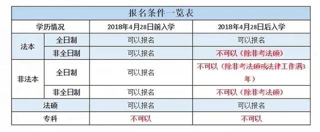 “老人”是指2018年4月28日以前入学,其报名条件为“老人老办法”,即:(一)已经毕业:有本科毕业证(含非全日制自考本科,及非法学专业);(二)未毕业:本科在读,且属于大三升大四阶段(含非法学专业);(三)专科不可报名。“新人”是指2018年4月28日以后入学,其报名条件为“新人新办法”,即:(一)一般条件:全日制+法学专业+本科以上、全日制+非法学本科+法律或法学硕士、全日制+非法学本科+3年法律工作。注意:学历和学位同时需要,只有学历证书而没有学位证书不满足条件。(二)放宽报名条件:放宽地区,非法学专业和非全日制(自考),本科或以上均可参考,具体地区及放宽条件请参看司法部当年公告,简单概括即是艰苦边远和民族地区。(三)在校生:大三升大四,但仍需遵循上述一般报名条件和放宽报名条件。