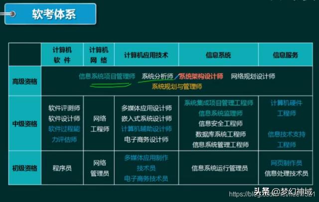 软考涵盖计算软件、计算机网络、计算机应用技术、信息系统、信息服务五个领域,对应的高级资格考试分别是信息系统项目管理师、系统分析师、系统架构设计师、网络规划设计师、系统规划与管理师。