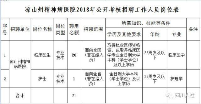 凉山州民政局公开考核招聘凉山州精神病医院工作人员21名
