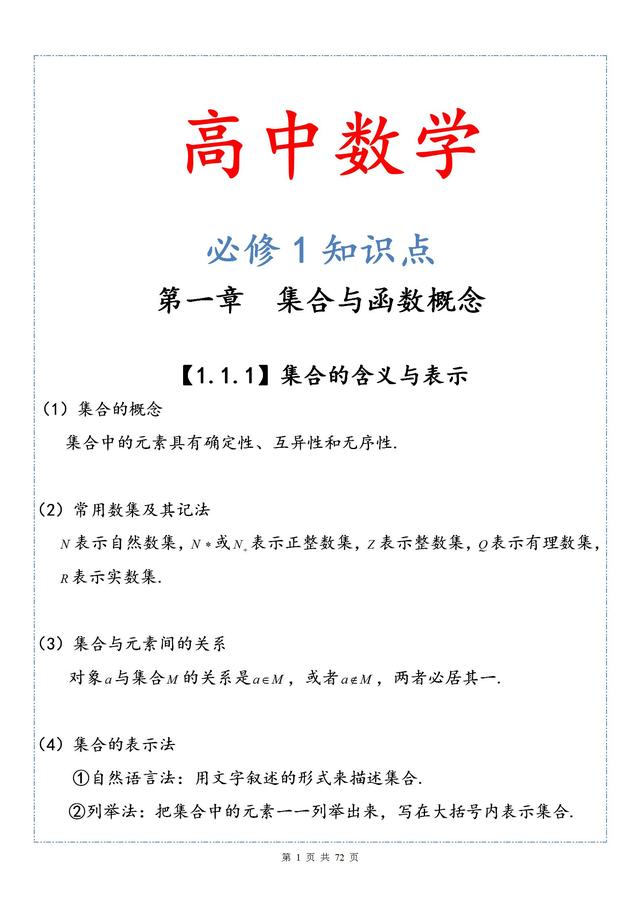 高中数学必修一知识点总结(数学必修一知识点总结) 初中到高中的学习需要一定的过渡,尤其是数学方面,学习内容和思维习惯方面都有很大的变化。 做多少题目并不重要,对于这一部分同学而言,把基础的知识体系梳理好。 今天小陈整理了高中数学必修一的内容给大家,让同学们的成绩有所提高。 下面章节有限,需要完整电子版评论私信小陈。