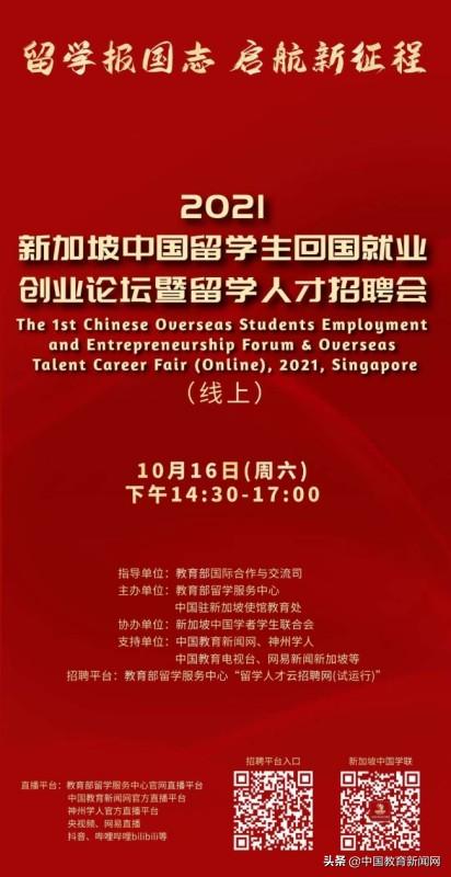 中国驻新加坡大使馆教育处首次联合教育部留学服务中心,于10月16日下午在线举办“2021新加坡中国留学生回国就业创业论坛暨留学人才招聘会”(线上)。“想留学生之所想、急留学生之所急、解留学生之所困”,帮助解决同学们在回国就业、留学报国中遇到的实际困难,搭建交流共享的平台,开辟新的就业渠道,创造回国服务机会。本次活动主题为“留学报国,回国服务”,设开幕式、主题论坛及留学人才云端招聘会等环节,采取网络直播形式,招聘活动预计持续2至4周。旨在为广大留学人员办实事,为留学工作开新局,为海外中国留学生与国内用人单位搭建交流分享平台,帮助对接海外留学人才资源,鼓励广大海外留学人员回国就业、创新创业,服务国家建设。新加坡中国学者学生联合会协办本次活动。