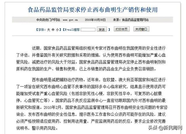 原国家食药监局曾组织相关专家对西布曲明在我国使用的安全性进行评估,认为其减肥治疗的风险大于效益。2010年2月26日,原国家食药监局对于西布曲明进行安全信息及风险提示,2010年10月30日正式发布通知,要求停止生产销售西布曲明制剂及原料药。