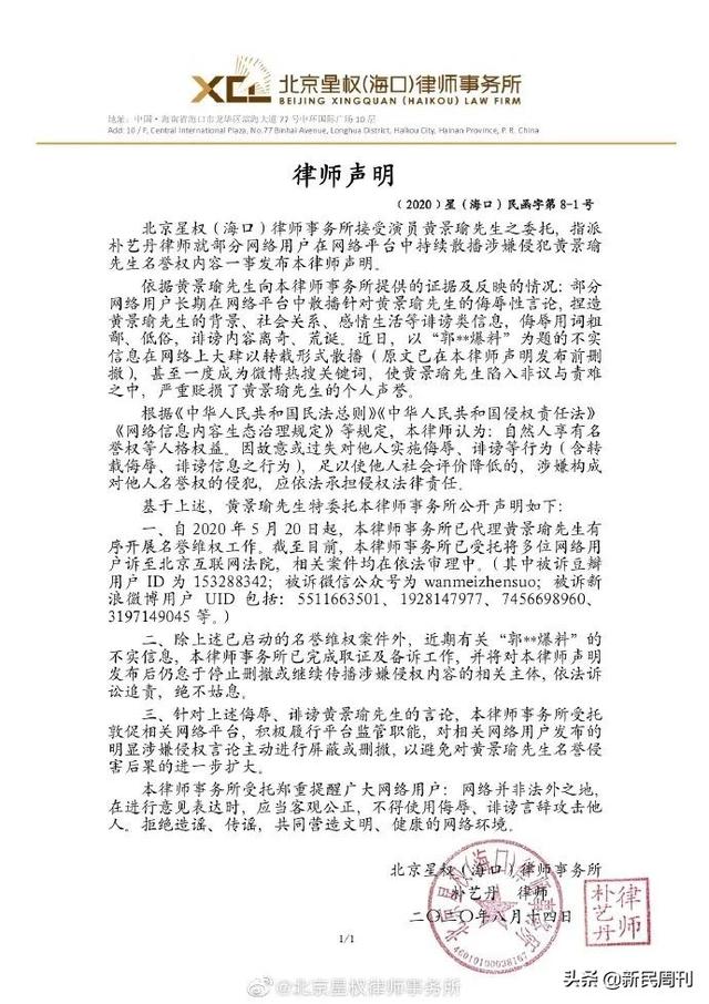 2020年8月,出狱一年多的郭美美曝光黄景瑜是她前男友,终于等来了回应——黄景瑜发了律师函,吓得郭美美删了相关微博。