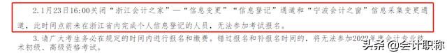 根据浙江财政厅的公告,报名初级会计考试需要先完成信息采集,“浙江会计之家”—“信息变更”、“信息登记”通道和“宁波会计之窗”信息采集变更通道将于2022年1月23日16:00关闭。
