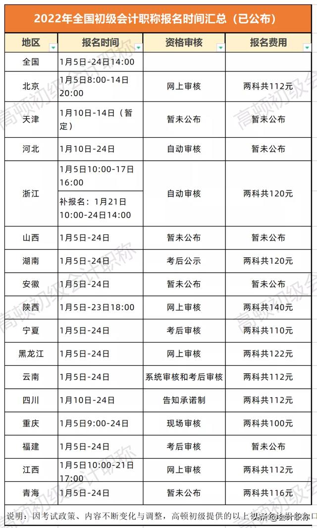 截至目前,已经有16个地区公布了本地区的2022年初级会计考试报名时间,为了方便各位考生进行查看,高顿君对各地区的报名时间、资格审核方式、报名费进行了最新汇总,希望能够帮助到大家报名。