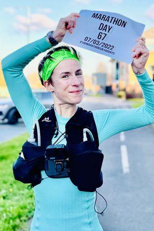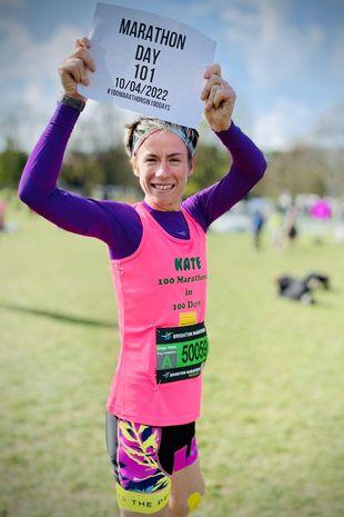 (凯特·杰登连续跑马拉松的第101天。)