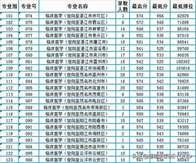 由于各地情况不一样,所以录取分数也相差较大,比如定向至湛江市赤坎区的录取最低分为556分,而定向至湛江市徐闻县的录取最低分只有522分。其他县市的录取情况,详见下表。