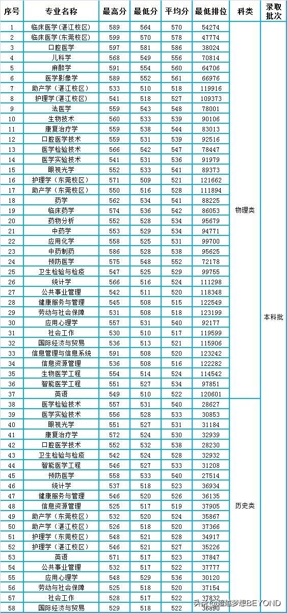 物理类专业录取最高分599分(临床医学-东莞校区),录取最低分508分,最低排位123242;历史类专业录取最高分572分(康复治疗学),录取最低分517分,最低排位37905。普通类各专业的详细录取分数以及最低排位情况,请看下表。