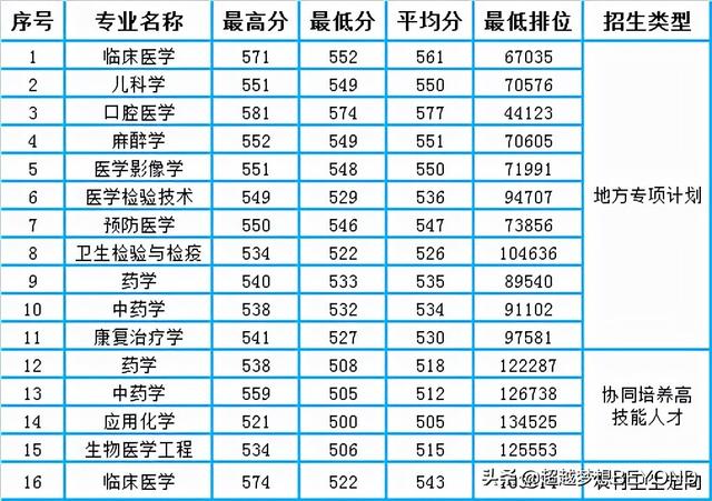 协同培养高技能人才录取最高分559分、最低分500分,最低排位134525;农村卫生定向录取最高分574分、最低分522分,详见下表。