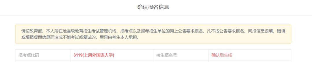 选择好报考点后点击下一步,即可校对填报信息,若没有错误请点击“确认报名”生成报名号,并下载报名信息表。生成报名号之后,网上报名即顺利完成。(如果选择的报考点采取网上交费,如上海外国语大学考点,则交费成功后才算报名成功)。
