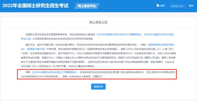 点击进入【填写报考信息】栏,阅读页面上出现的《网上报名公告》后,点击“阅读完毕”,继续阅读《考生诚信考试承诺书》,点击“同意”。并确认第一环节的“考生信息”填写无误。