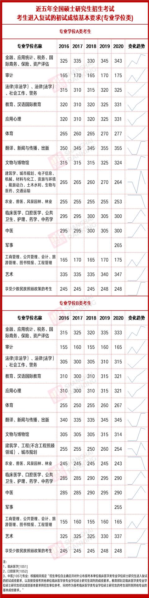近五年(2016-2020年)学术学位和专业学位国家线及趋势: