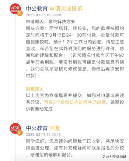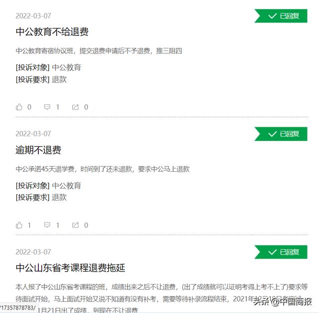 记者发现,除黑猫投诉平台外,还有不少网友在微博、知乎等社交媒体发帖反映中公教育协议保过班退费难问题。“多次致电询问退费进展均被搪塞过去,通过电话举报后,退款才很快到账”。记者还注意到,中公教育保过班退费拖延的问题亦成为福建省2021年全省投诉统计分析报告和消费维权的典型案例。