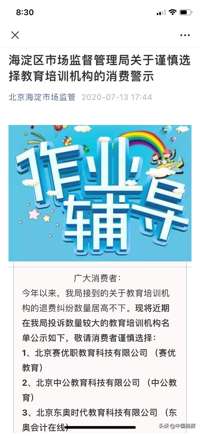 2020年7月13日,中公教育等四家培训机构因退费纠纷居高不下被北京市海淀区市场监督管理局点名。
