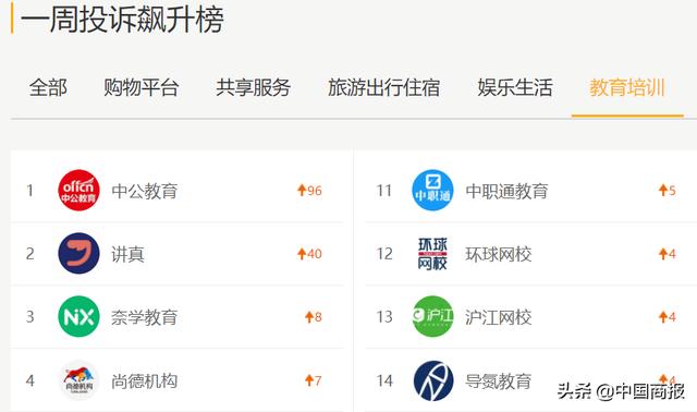 在黑猫消费者服务平台上,中公教育登上教育培训类企业一周投诉飙升榜榜首。