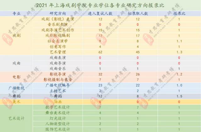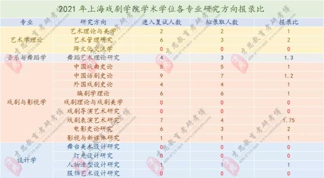 其中,跨文化交流、戏剧理论与戏剧美学、戏剧导演艺术研究、舞台美术设计研究、灯光设计研究、服饰艺术设计研究这几个方向没有进入复试人数则为0。