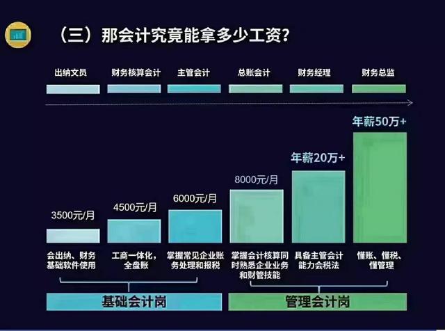做会计,你拿想多少工资? ①出文纳员:3500元/月 ②财核务算会计:4500元/月 ③主会管计:6000元/月 ④总会账计:10w+ ⑤财务经理:年薪20w+ ⑥财总务监:年薪50w+