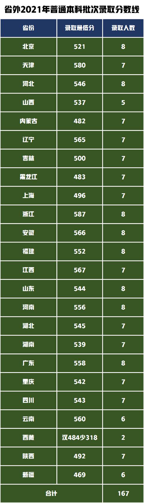 南京艺术学院2021年不组织专业考试,按高考文化成绩录取艺术专业共录取525人,其中在江苏省内录取358人,江苏省外录取167人。
