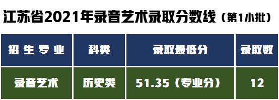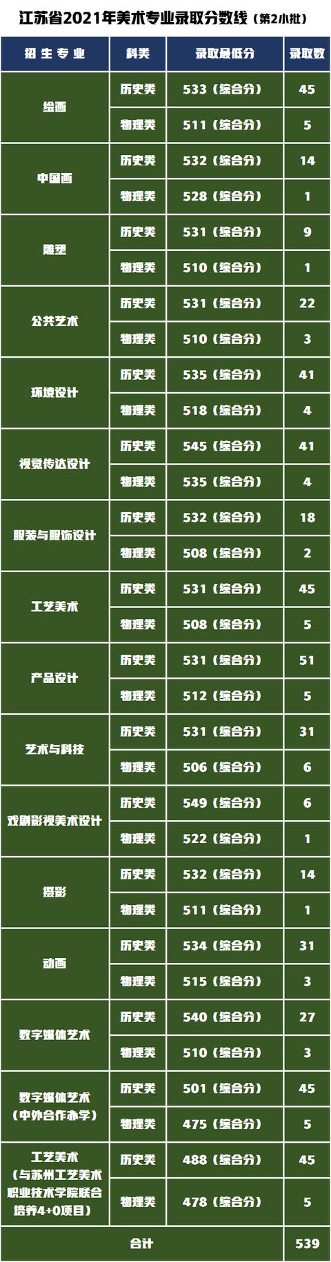 江苏省内美术艺考生文化成绩和省美术统考专业分均达到本科批次省控线, 按综合成绩排名录取,录取的专业及综合分成绩最低录取线见下表。