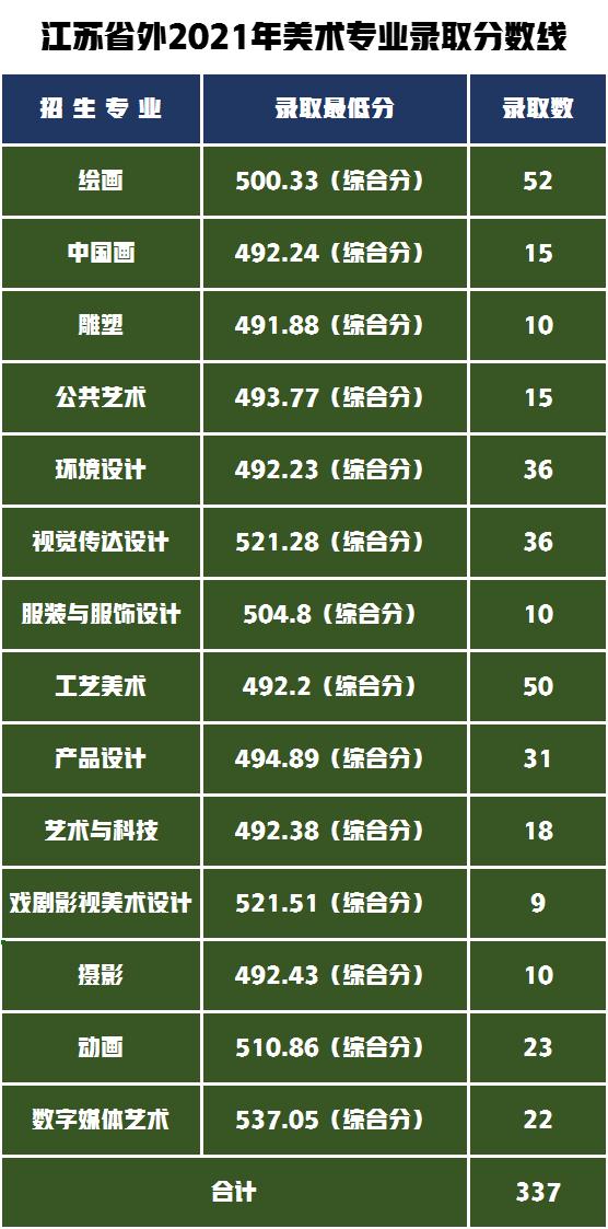 美术类专业2021年共录取876人,其中江苏省内录取美术艺考生539人,江苏省以外美术艺考生录取337人。