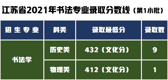 江苏省书法类专业省统考成绩合格,文化分达江苏省普通类本科相应批次省控线 80%, 按文化分择优录取10人,最低录取至412分。