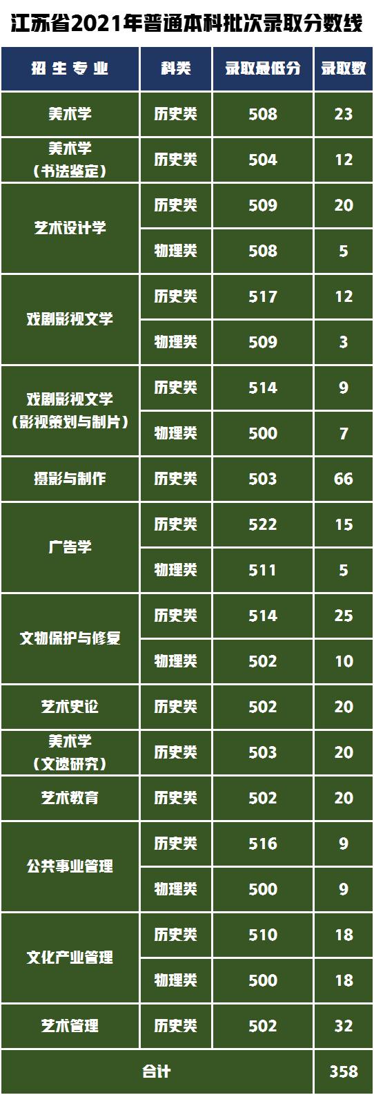 按高考文化成绩录取的艺术专业包括美术学、艺术设计学、影视文学等14个专业,在江苏省内高考文化成绩录取最低分为502分,最高分为522分,具体录取专业及人数录取成绩见下表。